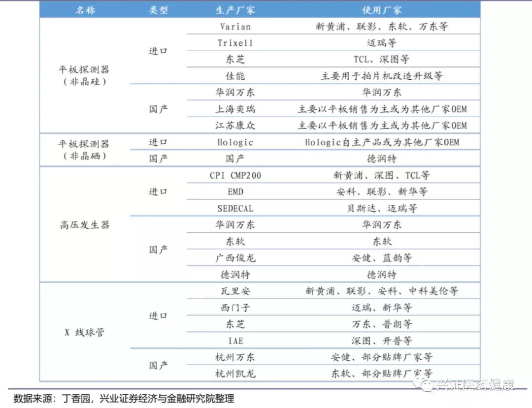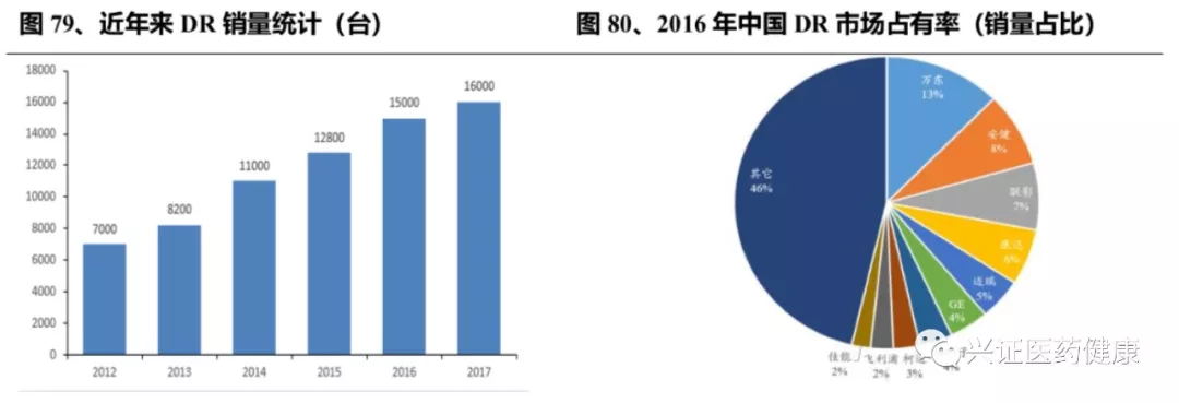 DR是指數(shù)字X線攝影(Digital Radiography),由數(shù)字探測(cè)器、高壓發(fā)生器、影像采集及處理系統(tǒng)、影像輸出設(shè)備等組成,是直接將X線光子信號(hào)通過數(shù)字探測(cè)器轉(zhuǎn)換為數(shù)字化圖像的放射影像設(shè)備,包括常規(guī)DR(靜態(tài)DR)及動(dòng)態(tài)DR兩種。靜態(tài)DR指用于普通拍片的數(shù)字化X射線攝影系統(tǒng);動(dòng)態(tài)DR指集數(shù)字化拍片、數(shù)字化透視、數(shù)字化胃腸造影等功能于一體的多功能動(dòng)態(tài)數(shù)字化X射線攝影系統(tǒng)。靜態(tài)DR呈現(xiàn)的是二維圖像,主要凸顯器官的大小與形狀,主要適用于胸部、腹部、骨等部位的檢查;動(dòng)態(tài)DR增加了時(shí)間維度的連續(xù)攝影觀察功能,可以進(jìn)行透視和造影等臨床檢查,比常規(guī)DR適用領(lǐng)域更廣、功能更強(qiáng)。常規(guī)DR 由于二維圖像的限制,主要作為基礎(chǔ)的輔助篩查工具,準(zhǔn)確診斷往往需要借助CT、MRI 等設(shè)備;動(dòng)態(tài)DR 能在透視情況下動(dòng)態(tài)觀察器官的情況,較大地提高了診斷的準(zhǔn)確性。根據(jù)咨詢公司Transparency Market Research 的研究報(bào)告顯示,到2018年,全球DR設(shè)備市場(chǎng)規(guī)模將達(dá)到133億美元,與2012年相比復(fù)合增長(zhǎng)率達(dá)到5.4%。2003 年起,我國醫(yī)院開始配置DR產(chǎn)品,并立即開始了對(duì)模擬X線攝影設(shè)備的替代過程,目前在主要城市和發(fā)達(dá)地區(qū)的綜合醫(yī)院已廣泛配置。目前中國市場(chǎng)銷售DR的外資品牌主要包括西門子、飛利浦、銳珂、GE、島津、東芝等。從品牌數(shù)量上看,國內(nèi)DR品牌商的數(shù)量遠(yuǎn)遠(yuǎn)大于國際品牌,目前市場(chǎng)上有50多家國內(nèi)DR品牌,且數(shù)量不斷增加。萬東醫(yī)療是國內(nèi)DR龍頭企業(yè),2018年DR年銷量達(dá)到1800臺(tái),市占率近20%。我們認(rèn)為全球大型醫(yī)療設(shè)備已經(jīng)進(jìn)入技術(shù)研發(fā)的平臺(tái)期,給中國廠商帶來快速跟進(jìn)的機(jī)會(huì),未來國產(chǎn)市占率會(huì)進(jìn)一步擴(kuò)大。