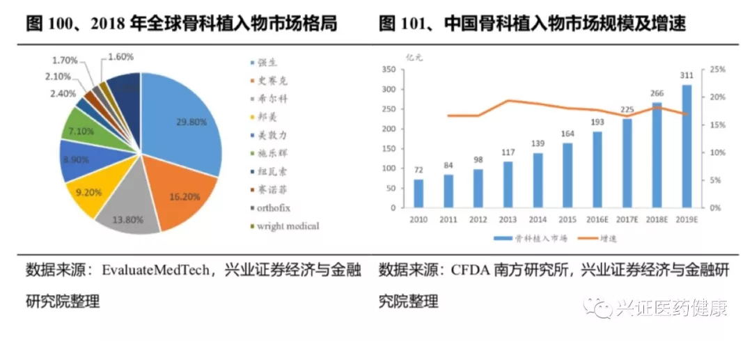 骨科植入物屬于高值耗材的重要大類之一,國內(nèi)市場(chǎng)一般有創(chuàng)傷、脊柱和關(guān)節(jié)三個(gè)細(xì)分。根據(jù)EvaluateMedTech 2018年發(fā)布的統(tǒng)計(jì)報(bào)告,骨科植入物在2018年?duì)I業(yè)收入達(dá)到375億美元,僅次于體外診斷、心血管以及影像診斷,為全球醫(yī)療器械行業(yè)第四大細(xì)分領(lǐng)域,占有總行業(yè)8.50%的市場(chǎng)份額。以全球骨科市場(chǎng)的角度來看,骨科行業(yè)的市場(chǎng)集中度很高,并且集中度有逐步提升的趨勢(shì)。2018年,前十大廠商占據(jù)整個(gè)市場(chǎng)92.8%的市場(chǎng)份額,而在2011年這一數(shù)字為80.3%,市場(chǎng)集中度的上升主要?dú)w功于大公司的并購,例如強(qiáng)生在2012年并購辛迪思后,市場(chǎng)份額從2011年的17.3%提升至2018年的29.8%。由于近年來中國老齡化程度的加深,老年骨病如骨質(zhì)疏松、椎間盤突出、股骨頸骨折等的發(fā)病率也持續(xù)提升,國內(nèi)骨科植入物市場(chǎng)在2010年至2017年高速發(fā)展,復(fù)合增速在15%左右,已成為世界第二大骨科植入物市場(chǎng),預(yù)計(jì)未來十年,骨科植入物在我國的發(fā)展?jié)摿σ廊痪薮蟆?/span>