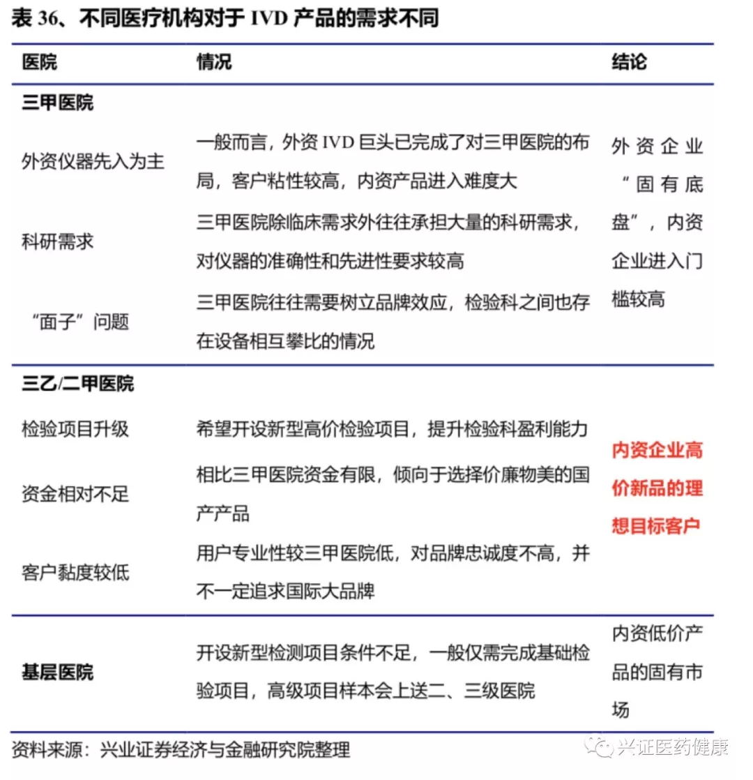 化學(xué)發(fā)光是典型的技術(shù)驅(qū)動(dòng)型產(chǎn)業(yè),研發(fā)壁壘較高。國產(chǎn)品牌的可靠性和穩(wěn)定性暫時(shí)難以滿足大型三甲醫(yī)院要求,但與二級(jí)及以下的基層醫(yī)院的剛性需求相契合。國產(chǎn)品牌在三甲醫(yī)院雖投放了少量特色檢驗(yàn)項(xiàng)目,但難以獲得腫瘤標(biāo)志物等核心項(xiàng)目,市場(chǎng)有限;而二級(jí)及以下的基層醫(yī)院存在傳染?。ǜ窝讬z測(cè))、性腺、甲功等大容量項(xiàng)目的剛性方法學(xué)替代需求,且較低的試劑價(jià)格(一般為進(jìn)口試劑的30%-50%)也滿足了醫(yī)院對(duì)經(jīng)費(fèi)預(yù)算限制。在IVD領(lǐng)域,因?yàn)獒t(yī)院檢驗(yàn)費(fèi)是打包收費(fèi)的,即檢驗(yàn)費(fèi)用已經(jīng)包含了相應(yīng)的診斷產(chǎn)品費(fèi)用,所以雖然醫(yī)院有動(dòng)力選擇高價(jià)格的新型檢測(cè)技術(shù),但在技術(shù)平臺(tái)確定后(即檢驗(yàn)費(fèi)用確定后),診斷產(chǎn)品即成為醫(yī)院的成本。在這種情況下,對(duì)于技術(shù)性能相當(dāng)或類似的同種產(chǎn)品,顯然醫(yī)院將偏好價(jià)格更低的產(chǎn)品,而低價(jià)格正是國內(nèi)IVD龍頭公司相比跨國公司的主要競(jìng)爭(zhēng)優(yōu)勢(shì)。三甲醫(yī)院由于外資產(chǎn)品先入為主,加之對(duì)科研和設(shè)備品牌的需求,內(nèi)資產(chǎn)品(尤其是診斷儀器)進(jìn)入難度較大;基層醫(yī)療機(jī)構(gòu)則由于經(jīng)費(fèi)和病人數(shù)目有限,難以形成規(guī)模效應(yīng),對(duì)于高通量的新檢測(cè)技術(shù)需求并不大;而三乙/二甲級(jí)別的中檔醫(yī)院既有動(dòng)力開展高價(jià)檢測(cè)項(xiàng)目,又由于資金相對(duì)不足,傾向于選擇物美價(jià)廉的產(chǎn)品,因此是內(nèi)資企業(yè)新產(chǎn)品的理想目標(biāo)客戶(且從歷史上來看,國內(nèi)IVD龍頭企業(yè)的全自動(dòng)生化儀/血液分析儀也主要是在三乙/二甲醫(yī)院進(jìn)行銷售)。