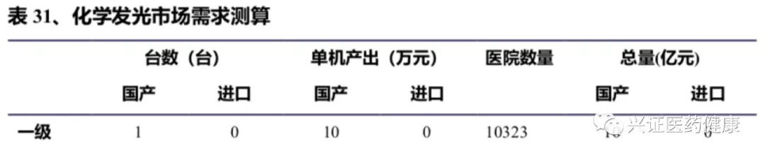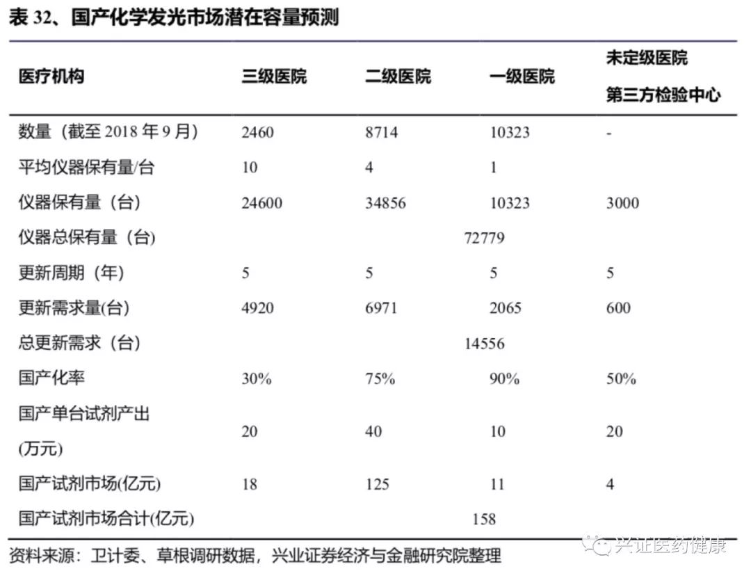 我們通過醫(yī)院端的市場(chǎng)對(duì)于化學(xué)發(fā)光的市場(chǎng)規(guī)模進(jìn)行估算:截至2018年9月,國內(nèi)三級(jí)醫(yī)院、二級(jí)醫(yī)院、一級(jí)醫(yī)院數(shù)量分別為2460、8714、10323家。自上而下測(cè)算發(fā)光需求,對(duì)于三級(jí)醫(yī)院,精確、穩(wěn)定的檢測(cè)結(jié)果是其關(guān)注重點(diǎn),這也是進(jìn)口化學(xué)發(fā)光品牌的“基本盤”。根據(jù)草根調(diào)研數(shù)據(jù),國內(nèi)頂尖三甲醫(yī)院中心檢驗(yàn)室大約擁有幾十臺(tái)發(fā)光儀器,儀器廠商較為分散,進(jìn)口占據(jù)90%的市場(chǎng);普通三級(jí)醫(yī)院擁有約10臺(tái)發(fā)光儀器,每個(gè)廠家儀器各1臺(tái),專機(jī)專用,檢測(cè)該廠家拳頭項(xiàng)目,例如羅氏的腫瘤標(biāo)志物、雅培的傳染病等,進(jìn)口儀器與國產(chǎn)儀器的比例約為7:3;對(duì)于二級(jí)醫(yī)院,平均擁有4臺(tái)發(fā)光儀器,由于其關(guān)注檢驗(yàn)的性價(jià)比,平均擁有3臺(tái)國產(chǎn)發(fā)光儀器,這也是國產(chǎn)品牌的“主戰(zhàn)場(chǎng)”;對(duì)于一級(jí)醫(yī)院,更為關(guān)注是否可以開展發(fā)光檢測(cè)項(xiàng)目及性價(jià)比,平均擁有1臺(tái)機(jī)器,多為國產(chǎn)。