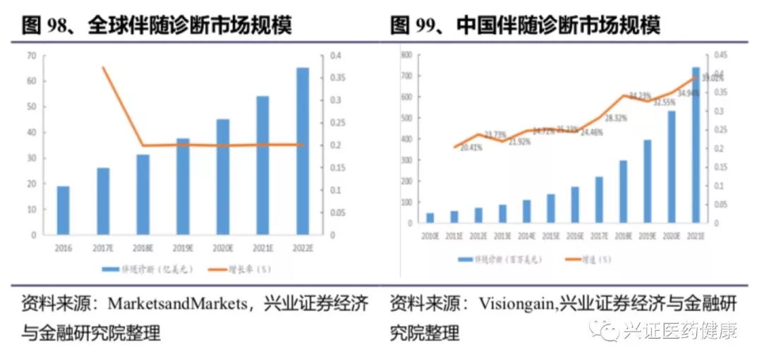 伴隨診斷(companion diagnostic,CDx)指能夠提供患者針對(duì)具體藥物的檢驗(yàn)報(bào)告、有助于降低藥物使用的風(fēng)險(xiǎn)并提高藥物治療有效率的診斷技術(shù)。伴隨診斷是分子診斷的下游應(yīng)用,通過對(duì)與疾病相關(guān)的結(jié)構(gòu)蛋白質(zhì)等免疫活性分子,以及編碼這些分子的基因進(jìn)行檢測(cè)來確定個(gè)體是否攜帶遺傳基因或相關(guān)部位已發(fā)生病變,精準(zhǔn)的伴隨診斷結(jié)果能為臨床選擇合適的靶向藥物提供有力的依據(jù),通過檢測(cè)人體內(nèi)差異蛋白、突變基因等,篩選靶向藥物最佳用藥人群,對(duì)患者進(jìn)行個(gè)性化醫(yī)療,其適應(yīng)癥范圍主要集中在腫瘤領(lǐng)域。根據(jù)MarketsandMarkets數(shù)據(jù),2016年全球伴隨診斷市場(chǎng)規(guī)模約19億美元,到2018年預(yù)計(jì)31億美元,2016年至2022年的年復(fù)合增長(zhǎng)率將達(dá)到22.78%。目前中國市場(chǎng)規(guī)模約3億美元,過去7年,中國CAGR超30%,且有加速趨勢(shì)。