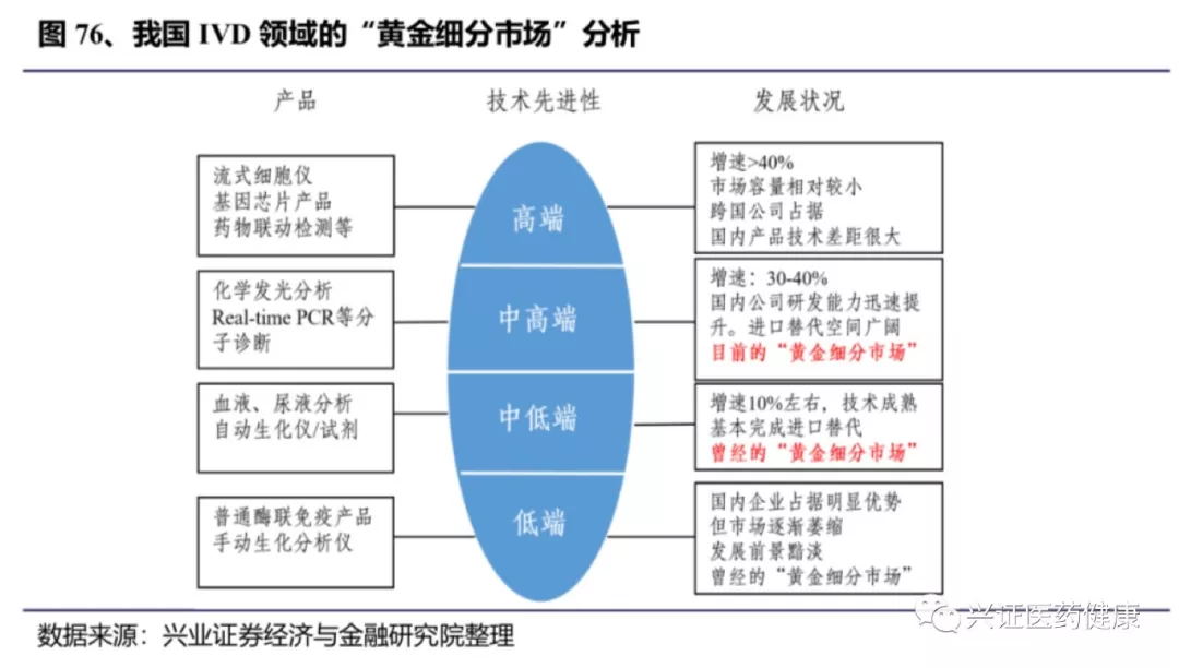 我國IVD市場(chǎng)總體呈現(xiàn)低端市場(chǎng)增長(zhǎng)停滯、中端市場(chǎng)迅速放量、高端市場(chǎng)逐步開拓的格局,我們?cè)谶@里稱之為IVD的“橄欖型”市場(chǎng)結(jié)構(gòu)。在“橄欖型”IVD市場(chǎng)結(jié)構(gòu)中,低端的酶免市場(chǎng)已經(jīng)完成進(jìn)口替代,高速增長(zhǎng)漸行漸遠(yuǎn);國內(nèi)企業(yè)囿于儀器研發(fā)實(shí)力較弱,短期內(nèi)在高端檢測(cè)(如流式細(xì)胞儀、全基因組測(cè)序等)領(lǐng)域競(jìng)爭(zhēng)力還較弱;而在生化診斷領(lǐng)域,國產(chǎn)全自動(dòng)生化分析儀的性能已經(jīng)趕上進(jìn)口產(chǎn)品水平,且具備了相當(dāng)?shù)膬r(jià)格優(yōu)勢(shì),目前國產(chǎn)市占率超過70%,已經(jīng)基本完成進(jìn)口替代,是過去5年的黃金細(xì)分市場(chǎng)。