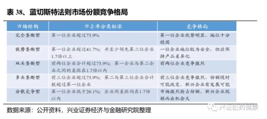 類比于我國創(chuàng)新藥研發(fā)的四步走戰(zhàn)略:即從研制“me-too”做起,第二步是 “me-better”,在原有基礎(chǔ)上進(jìn)行二次創(chuàng)新,第三步是“best-in-class”(BIC),第四步是“first-in-class”(FIC),我國醫(yī)療器械的研發(fā)策略也是逐步從“仿制”到“創(chuàng)新”。國外的醫(yī)療器械以顛覆性產(chǎn)品、微創(chuàng)新產(chǎn)品為主,技術(shù)含量較高,且需要自己做學(xué)術(shù)推廣。國內(nèi)醫(yī)療器械研發(fā)模式可以大致分為兩種,一種是類似于me-too或者me-better創(chuàng)新藥,跟隨進(jìn)口器械,或在其基礎(chǔ)上進(jìn)行一定程度的改進(jìn),研發(fā)風(fēng)險(xiǎn)較低,而且進(jìn)口產(chǎn)品已經(jīng)在前期做了一定的學(xué)術(shù)推廣工作;另一種是自主創(chuàng)新的微創(chuàng)新類產(chǎn)品,國內(nèi)市場(chǎng)先前并沒有進(jìn)口產(chǎn)品,例如健帆生物的血液灌流器等,國內(nèi)企業(yè)自己建立直營(yíng)團(tuán)隊(duì)做用戶教育和學(xué)術(shù)推廣,憑借品牌力搶占先發(fā)優(yōu)勢(shì)。對(duì)于第二類產(chǎn)品,屬于進(jìn)口替代之外的投資邏輯。醫(yī)療器械領(lǐng)域除了少數(shù)高端產(chǎn)品技術(shù)壁壘較高外,其他產(chǎn)品的研發(fā)周期很短,所以能否看準(zhǔn)時(shí)機(jī),先發(fā)搶占市場(chǎng)份額非常關(guān)鍵。根據(jù)藍(lán)切斯特法則,市場(chǎng)份額相差在1.7倍之內(nèi)的為企業(yè)競(jìng)爭(zhēng)的射程范圍。據(jù)此,可將市場(chǎng)結(jié)構(gòu)分為完全壟斷、優(yōu)勢(shì)壟斷、雙頭壟斷、多頭壟斷以及分散競(jìng)爭(zhēng)五類。