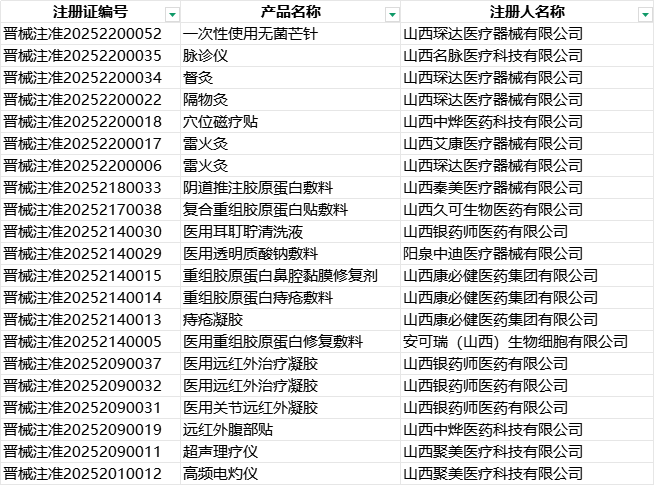 根據(jù)山西省藥品監(jiān)督管理局2025年1-3月發(fā)布的醫(yī)療器械注冊(cè)數(shù)據(jù),共新增21個(gè)第二類醫(yī)療器械注冊(cè)證,涉及11家注冊(cè)人企業(yè),聚焦中醫(yī)器械與生物敷料領(lǐng)域的“本地化+跨省協(xié)作”。