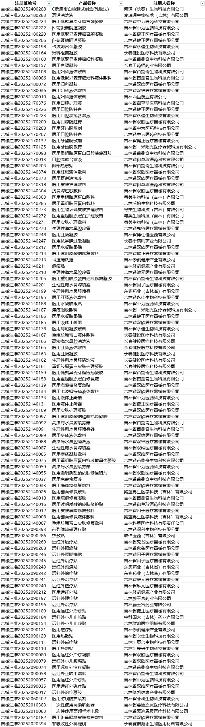 2025年上半年,吉林省二類醫(yī)療器械注冊呈現(xiàn)出以敷料類產(chǎn)品為主導(dǎo):占比超過72%,以婦科凝膠、口腔護(hù)理、皮膚修復(fù)類產(chǎn)品為主;跨省協(xié)作顯著:約19.1%的產(chǎn)品委托至河南、遼寧、廣東等地生產(chǎn),形成跨區(qū)域產(chǎn)業(yè)鏈協(xié)同;長春為核心聚集地:近80%的注冊人位于長春,依托多個產(chǎn)業(yè)園區(qū)形成集群效應(yīng);功能性產(chǎn)品突出:遠(yuǎn)紅外貼、止鼾液、疤痕修復(fù)等產(chǎn)品具有明顯消費(fèi)醫(yī)療屬性,適合家用市場。