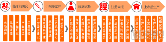 醫(yī)療器械研發(fā)外包服務(wù)涵蓋臨床前研究、小規(guī)模試產(chǎn)、臨床試驗(yàn)、注冊(cè)申報(bào)和上市后生產(chǎn)5個(gè)環(huán)節(jié)。根據(jù)不同環(huán)節(jié)提供針對(duì)性的服務(wù),主要包括市場(chǎng)調(diào)研、風(fēng)險(xiǎn)管理、產(chǎn)品定型、廠房設(shè)計(jì)建設(shè)、工藝流程優(yōu)化、臨床試驗(yàn)方案設(shè)計(jì)、申報(bào)資料編寫、規(guī)?;猩a(chǎn)等。醫(yī)療器械研發(fā)外包服務(wù)企業(yè)包括醫(yī)療器械CRO與醫(yī)療器械CDMO兩類。