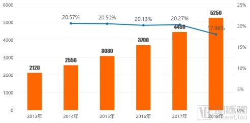 圖4 2013-2018年中國(guó)醫(yī)療器械市場(chǎng)規(guī)模(億元);