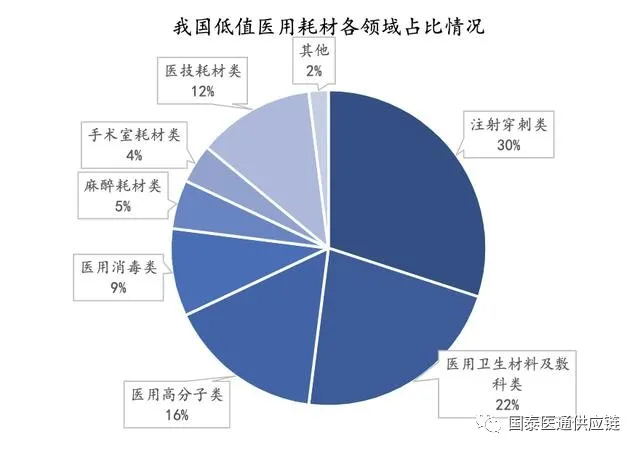 低值耗材細(xì)分市場(chǎng)占比:注射穿刺類占比達(dá)30%,其次為醫(yī)用衛(wèi)生材料及敷料類,市場(chǎng)份額達(dá)22%。市場(chǎng)份額排名前五的領(lǐng)域分別是注射穿刺類、醫(yī)用衛(wèi)生材料及敷料類、醫(yī)用高分子材料類、醫(yī)技耗材類和醫(yī)用消毒類。
