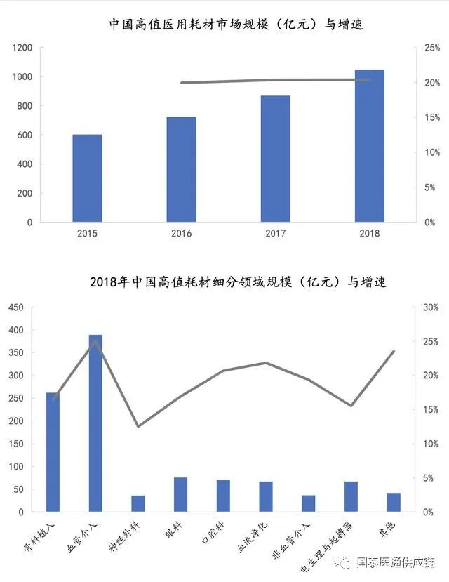 高值耗材市場(chǎng)規(guī)模:近年,國內(nèi)市場(chǎng)規(guī)模增速保持在20%左右,2018年市場(chǎng)規(guī)模已超1000億元。