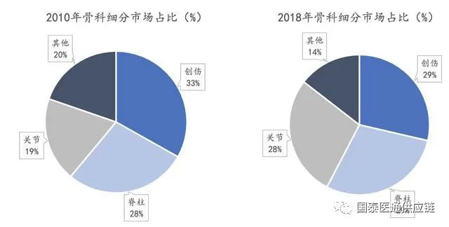 我國骨科細(xì)分市場(chǎng):創(chuàng)傷、脊柱和關(guān)節(jié)產(chǎn)品占超85%的市場(chǎng),其中創(chuàng)傷類產(chǎn)品因技術(shù)要求相對(duì)較低,發(fā)展較為成熟,而脊柱和關(guān)節(jié)類產(chǎn)品近年來發(fā)展迅速。2018年,脊柱類已經(jīng)超越創(chuàng)傷類成為市場(chǎng)份額最大的骨科品類,占比達(dá)到29.01%。