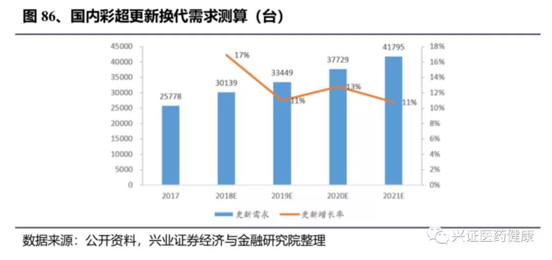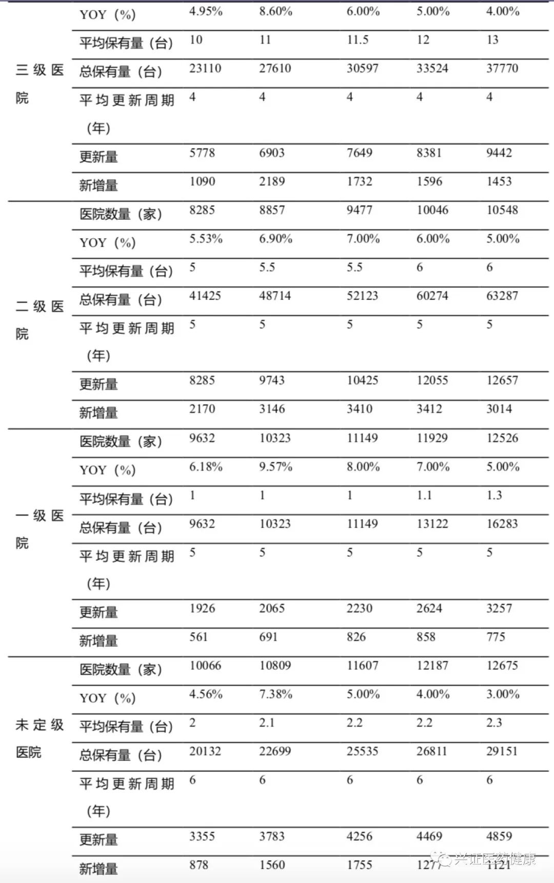 彩超是利用超聲多普勒技術(shù)和超聲回波原理,采集血流運動、組織運動信息和人體器官組織成像供臨床超聲診斷檢查使用的設(shè)備。國產(chǎn)設(shè)備以性價比優(yōu)勢,逐步擠占進口品牌市場份額。在全球市場中,通用、飛利浦、東芝、日立和西門子占據(jù)了主要的市場份額,國產(chǎn)企業(yè)邁瑞和開立也躋身全球前十名。國內(nèi)市場上,2017年,GE 和飛利浦占據(jù)50%以上的市場份額,西門子近幾年市場份額日益萎縮,已被邁瑞醫(yī)療超越。2014年,全球醫(yī)用超聲診斷設(shè)備市場規(guī)模已達(dá)62億美元,預(yù)計2019年,規(guī)模將達(dá)74億美元,年均復(fù)合增長率為3.6%。2014年,國內(nèi)超聲診斷設(shè)備市場69億元, 由于醫(yī)療反腐,2015年彩超設(shè)備的銷量下滑明顯,當(dāng)年銷量為23970臺。隨著設(shè)備新增及更新?lián)Q代需求擴大,中國超聲設(shè)備市場還將快速增長,預(yù)計2019年,中國醫(yī)用超聲診斷設(shè)備市場規(guī)模將達(dá)91億元,年均復(fù)合增長率5.7%。未來五年,是國內(nèi)彩超完成進口替代的關(guān)鍵五年,伴隨著以邁瑞醫(yī)療、開立醫(yī)療為首的國產(chǎn)彩超企業(yè)技術(shù)平臺不斷升級。邁瑞醫(yī)療2013年并購高端超聲影像制造商Zonare 加快了公司產(chǎn)品向高端延伸的進程,2016-2017年,公司先后推出了Resona7 等高端彩超產(chǎn)品,受到市場的廣泛認(rèn)可,公司超聲影像類產(chǎn)品的整體形象快速提升。開立醫(yī)療于2016年底推出全新高端S50彩超平臺,上市后迅速放量,目前S50在總收入中的占比提升到近25%,今年一季度又推出嵌入人工智能的S60彩超平臺,配置第二代的單晶探頭,成像速度、信噪比、靈敏度都有所提升,預(yù)計未來3年內(nèi)高端彩超收入占比能夠達(dá)到40%以上,醫(yī)院覆蓋率的提升以及存量儀器的更新?lián)Q代促進彩超的銷售。國產(chǎn)企業(yè)超聲核心部件的研發(fā)水平已媲美GPS,超聲探頭技術(shù)是決定超聲系統(tǒng)性能的核心技術(shù)之一,例如開立醫(yī)療在當(dāng)今超聲領(lǐng)域最高端的單晶探頭技術(shù)方面,躋身國際一流水平,為整個系統(tǒng)性能的先進性提供了核心技術(shù)保障。截至2017年底,各類衛(wèi)生機構(gòu)的彩超平均保有量不同。根據(jù)草根調(diào)研數(shù)據(jù),三級醫(yī)院平均可達(dá)10臺,二級醫(yī)院5臺,一級醫(yī)院1臺,未定級醫(yī)院2臺(主要為民營醫(yī)院),社區(qū)衛(wèi)生機構(gòu)0.5臺,婦幼保健機構(gòu)1臺。未來國內(nèi)彩超的需求新增主要來自三方面:一是現(xiàn)有彩超的更新替代,彩超平均更新周期為5年,對于使用頻繁、損耗較快的三級醫(yī)院不到5年就需要更換彩超設(shè)備;二是新建醫(yī)療衛(wèi)生機構(gòu)帶來的增量需求;三是胸痛、卒中、創(chuàng)傷、危重孕產(chǎn)婦、危重新生兒等市級五大救治中心和縣區(qū)分中心的建設(shè),胸痛中心、危重孕產(chǎn)婦救治中心、危重新生兒救治中心和卒中中心均要求配置不少于1臺彩超,其中胸痛中心自2017年開始建設(shè),根據(jù)中國胸痛中心系統(tǒng)化建設(shè)項目規(guī)劃,預(yù)計到2019年底,全國將建成超過1000家胸痛中心,預(yù)計最少新增1000臺彩超,而2018年才開始建設(shè)的其余四大中心,預(yù)計將在3-5年全部完成建立,屆時預(yù)計每年釋放超過2000臺的彩超需求?;谝陨戏治觯覀儗Σ食瑖鴥?nèi)市場空間進行測算如下: