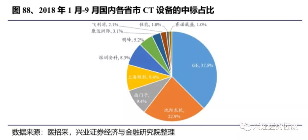CT是根據(jù)人體不同組織對X線的吸收與透過率的不同,應(yīng)用靈敏度極高的儀器對人體進行測量,然后將測量所獲取的數(shù)據(jù)輸入計算機,再對數(shù)據(jù)進行處理后,就可攝下人體被檢查部位的斷面或立體的圖像,發(fā)現(xiàn)體內(nèi)任何部位的細(xì)小病變。根據(jù)中國醫(yī)學(xué)裝備協(xié)會發(fā)布的《2016年中國CT設(shè)備市場研究報告》,截止到2016年底,CT設(shè)備全國市場保有量突破20000臺,相比2015年的19592臺,保有量增長10%;2012-2016年CT保有量復(fù)合增長率為10.2%。2012年-2016年,我國CT設(shè)備市場每年新增銷量從2074臺增長到了2575臺,年復(fù)合增長率為5%。我國在用的12074臺CT設(shè)備中,GPS呈現(xiàn)三足鼎立的競爭格局,其中GE占34%,西門子占28%,飛利浦占14%,合計市占率達(dá)到86%。由于近年來國家政策的鼓勵,東軟、聯(lián)影、安科等國產(chǎn)企業(yè)也開始發(fā)力,進口設(shè)備的比例將持續(xù)降低。值得一提的是,在二級醫(yī)院市場中,國產(chǎn)品牌代表之一的東軟醫(yī)療打破國外壟斷,以超過10%的占有率躋身一線品牌行列。根據(jù)2018年1月-9月的全國各省市CT中標(biāo)結(jié)果來看,GE、東軟的中標(biāo)數(shù)最高,分別為36和22臺;其次為西門子、聯(lián)影、安科,佳能、賽諾威盛中標(biāo)數(shù)量相對較少,已經(jīng)可以看到國產(chǎn)CT實現(xiàn)進口替代的曙光。根據(jù)《2016年中國CT設(shè)備市場研究報告》,2015年,單雙層低端CT市場保有量占CT市場總額的51%,三級醫(yī)院主力機型64排及以上高端CT市場保有量占比接近20%。2015年16排CT銷量份額48%,單雙層CT銷量份額為15%,份額持續(xù)下滑,64排及以上高端CT銷量份額36%。近幾年,64排CT逐步代替16排CT成為縣級醫(yī)院的主力機型,而16排CT主要在鄉(xiāng)鎮(zhèn)衛(wèi)生院裝機較多。CT作為鄉(xiāng)鎮(zhèn)衛(wèi)生院服務(wù)能力標(biāo)準(zhǔn)(2018年版)A類鄉(xiāng)鎮(zhèn)衛(wèi)生院必配設(shè)備,基層醫(yī)療機構(gòu)更傾向于采購國產(chǎn)設(shè)備,一方面可以降低患者檢查成本,另一方面可以降低售后服務(wù)成本,這為國產(chǎn)品牌如東軟、聯(lián)影、安科、萬東等的進口替代提供機會。國家衛(wèi)健委《大型醫(yī)用設(shè)備配置許可管理目錄(2018年)》提到部分設(shè)備如DSA、16排及以下CT、永磁磁共振無需再經(jīng)審批即可配置,對醫(yī)療機構(gòu)增加配置大型設(shè)備將起到正向激勵作用。衛(wèi)計委《關(guān)于發(fā)布2018—2020年大型醫(yī)用設(shè)備配置規(guī)劃的通知》中提到64排及以上CT未來三年內(nèi)國內(nèi)新增總臺數(shù)為3535臺,也利好國內(nèi)生產(chǎn)該類設(shè)備的企業(yè)。此外,根據(jù)《2016年中國CT設(shè)備市場研究報告》,截止到2016年初,59%的CT設(shè)備購置在2010-2015年期間,28%的CT設(shè)備購置在2005-2010年期間,13%的CT設(shè)備購置在2005年以前,使用已超過10年,超期服役的設(shè)備大約有1500多臺,這也是下一批更新?lián)Q代的主要對象,國產(chǎn)廠商有望搶奪部分市場份額。目前,我國國產(chǎn)CT的技術(shù)難點主要在于探測單元的制造工藝,要求探測單元陣列數(shù)多(即排數(shù)多)、旋轉(zhuǎn)及感應(yīng)速度快,對拼接工藝又有極高的標(biāo)準(zhǔn),需要單元與單元間隙盡可能小。在東軟醫(yī)療的帶領(lǐng)下,我國CT研發(fā)不斷實現(xiàn)技術(shù)突破,從東軟2012年推出首臺中國研制64排螺旋CT到2015年的128排螺旋CT,聯(lián)影、安科、萬東等企業(yè)也緊跟其腳步。目前,我國CT行業(yè)第一梯隊主要致力于64排CT的研發(fā)和注冊,隨著滿足高性能檢測的64排CT的陸續(xù)上市,預(yù)計我國CT格局將發(fā)生改變。