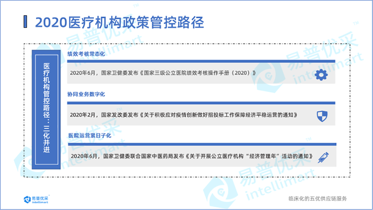 總體來(lái)看,國(guó)家對(duì)公立醫(yī)療機(jī)構(gòu)的管控主要集中在三個(gè)層面。其一是績(jī)效考核的常態(tài)化,其二是受新冠疫情的影響,公立醫(yī)院對(duì)于線上交互的需求激增,協(xié)同業(yè)務(wù)甚至更多的管理方式將逐步向數(shù)字化轉(zhuǎn)變。其三是隨著成本壓力的陡增,國(guó)家已明確要求公立醫(yī)療機(jī)構(gòu)應(yīng)牢固樹立“過(guò)緊日子”的理念,花好每一分錢。