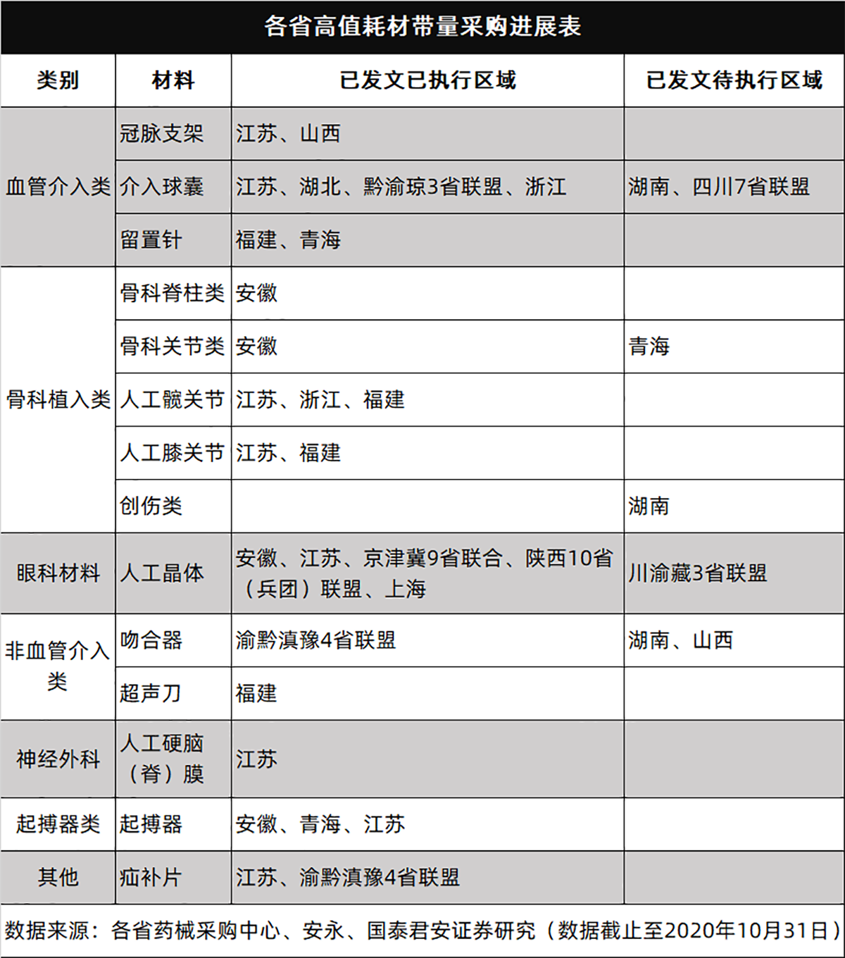 與藥品不同,高值耗材帶量采購(gòu)地方的探索并不遜于國(guó)家層面。根據(jù)國(guó)泰君安證券研究統(tǒng)計(jì),2020年11月5日,國(guó)家冠脈支架帶量采購(gòu)?fù)瓿桑?0款入圍產(chǎn)品平均終端價(jià)格降幅超過(guò)90%。地方帶量采購(gòu)截至2020年11月20日,已完成或正在進(jìn)行的省級(jí)聯(lián)盟采購(gòu)6項(xiàng),省及直轄市獨(dú)立采購(gòu)11項(xiàng),地市級(jí)(含聯(lián)盟)采購(gòu)30余項(xiàng),集中在心血管介入、骨科、眼科三大領(lǐng)域,平均終端價(jià)格降幅約60%。中國(guó)高值耗材行業(yè)正式進(jìn)入帶量采購(gòu)時(shí)代。