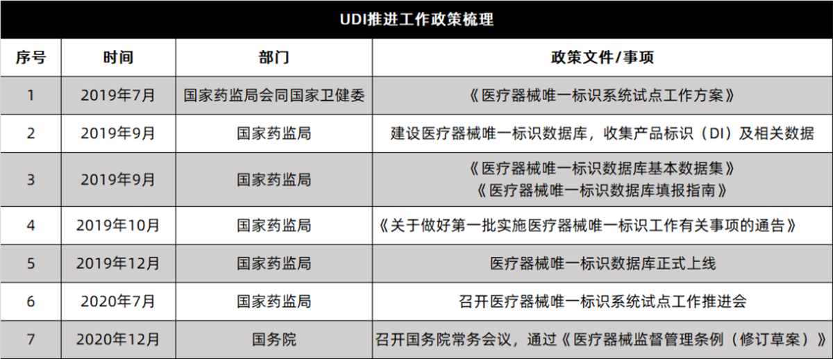 2020年7月,國(guó)家藥監(jiān)局召開(kāi)醫(yī)療器械唯一標(biāo)識(shí)系統(tǒng)試點(diǎn)工作推進(jìn)會(huì),進(jìn)一步推進(jìn)各試點(diǎn)單位UDI探索工作。12月,國(guó)務(wù)院常務(wù)會(huì)議召開(kāi),通過(guò)《醫(yī)療器械監(jiān)督管理?xiàng)l例(修訂草案)》,并重點(diǎn)強(qiáng)調(diào)要充實(shí)監(jiān)管手段,增設(shè)產(chǎn)品唯一標(biāo)識(shí)追溯、延伸檢查等監(jiān)督措施。