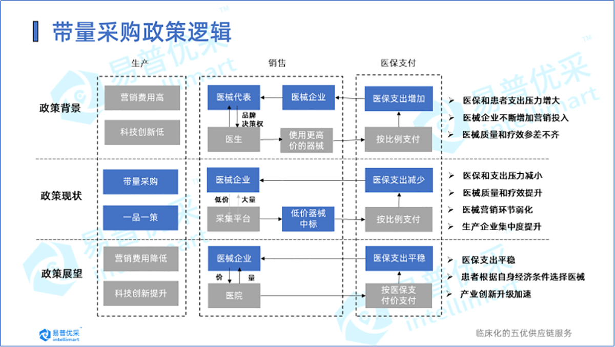 高值耗材帶量采購(gòu)的政策邏輯與藥品相似,均是通過(guò)以量換價(jià),降低虛高價(jià)格,節(jié)省醫(yī)保資金。對(duì)于產(chǎn)業(yè)而言,械企憑借研發(fā)/生產(chǎn)/質(zhì)量控制/管理等綜合優(yōu)勢(shì),在質(zhì)量能夠保證的前提下通過(guò)低價(jià)中標(biāo),由支付方——醫(yī)保保障量的落實(shí),減少渠道、終端推廣費(fèi)用,可將械企從無(wú)序的流通環(huán)節(jié)中解放出來(lái),加強(qiáng)創(chuàng)新研發(fā),避免同質(zhì)競(jìng)爭(zhēng),引導(dǎo)產(chǎn)業(yè)創(chuàng)新升級(jí)。