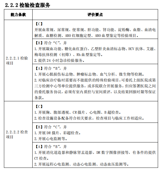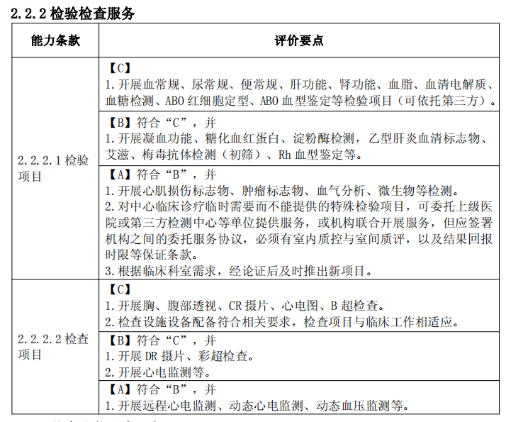 社區(qū)衛(wèi)生服務(wù)中心檢驗檢查服務(wù)項目:【C】開展血常規(guī)、尿常規(guī)、便常規(guī)、肝功能、腎功能、血脂、血清電解質(zhì)、血糖檢測、ABO 紅細(xì)胞定型、ABO 血型鑒定等檢驗項目(可依托第三方)。1.開展凝血功能、糖化血紅蛋白、淀粉酶檢測,乙型肝炎血清標(biāo)志物、艾滋、梅毒抗體檢測(初篩)、Rh 血型鑒定等。1.開展心肌損傷標(biāo)志物、腫瘤標(biāo)志物、血氣分析、微生物等檢測。2.對中心臨床診療臨時需要而不能提供的特殊檢驗項目,可委托上級醫(yī)院或第三方檢測中心等單位提供服務(wù),或機(jī)構(gòu)聯(lián)合開展服務(wù),但應(yīng)簽署機(jī)構(gòu)之間的委托服務(wù)協(xié)議,必須有室內(nèi)質(zhì)控與室間質(zhì)評,以及結(jié)果回報時限等保證條款。3.根據(jù)臨床科室需求,經(jīng)論證后及時推出新項目。