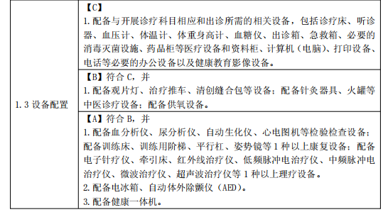 配備血分析儀、尿分析儀、自動生化儀、心電圖機(jī)等檢驗檢查設(shè)備;配備訓(xùn)練床、訓(xùn)練用階梯、平行杠、姿勢鏡等 1 種以上康復(fù)設(shè)備;配備電子針療儀、牽引床、紅外線治療儀、低頻脈沖電治療儀、中頻脈沖電治療儀、微波治療儀、超聲波治療儀等 1 種以上理療設(shè)備。