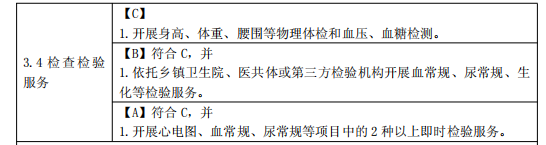 社區(qū)衛(wèi)生服務(wù)中心檢驗檢查服務(wù)項目:【C】1.開展身高、體重、腰圍等物理體檢和血壓、血糖檢測。1.依托鄉(xiāng)鎮(zhèn)衛(wèi)生院、醫(yī)共體或第三方檢驗機(jī)構(gòu)開展血常規(guī)、尿常規(guī)、生化等檢驗服務(wù)。1.開展心電圖、血常規(guī)、尿常規(guī)等項目中的 2 種以上即時檢驗服務(wù)。